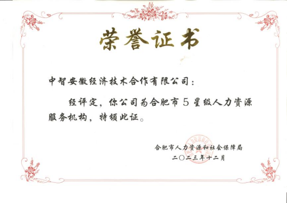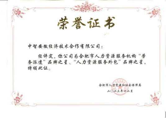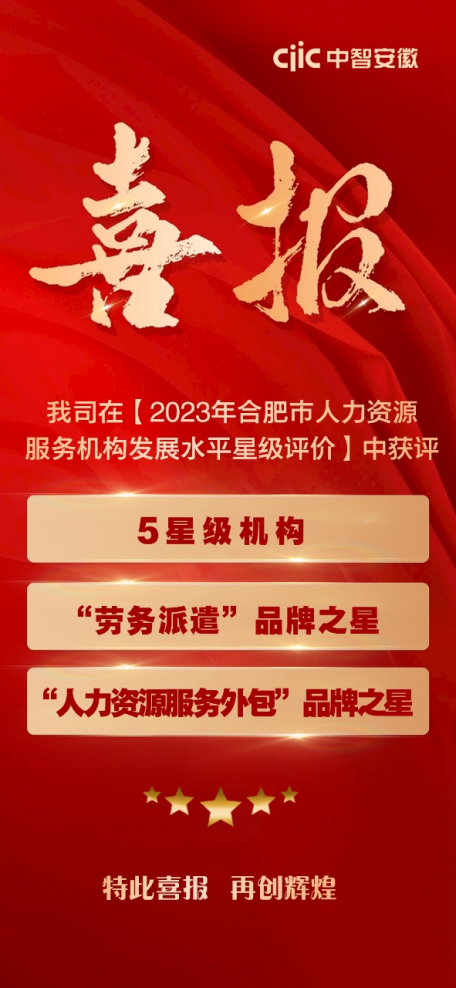 近日,合肥市人力资源和社会保障局公布了2023年度合肥市人力资源服务机构星级评定结果,中智安徽公司获评5星级人力资源服务机构,并荣膺“劳务派遣”与“人力资源服务外包”品牌之星。此次评定对参评企业的基本实力、信用体系、管理水平、发展潜力以及社会贡献等多个维度进行了考量,获此殊荣是对中智安徽公司的认可和鼓励。